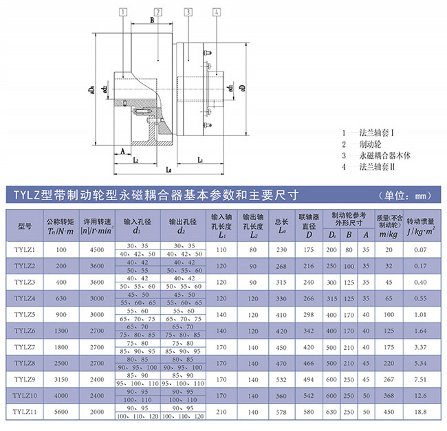 ■TYLZ型永磁耦合聯(lián)軸(保護(hù))器為帶制動(dòng)輪型,也可分為單法蘭軸套與雙法蘭軸套兩種聯(lián)接方式;