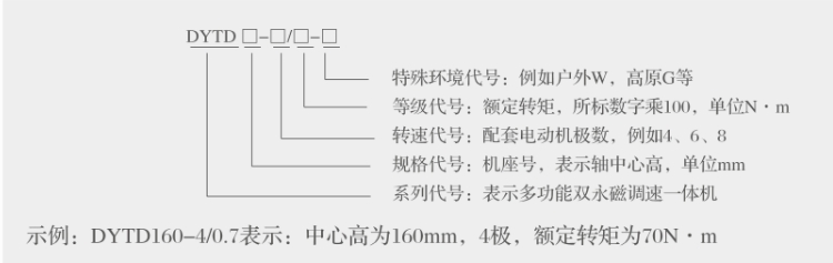 一體機型號由系列代號、規格代號、轉速代號、等級代號和環境代號五部分組成。